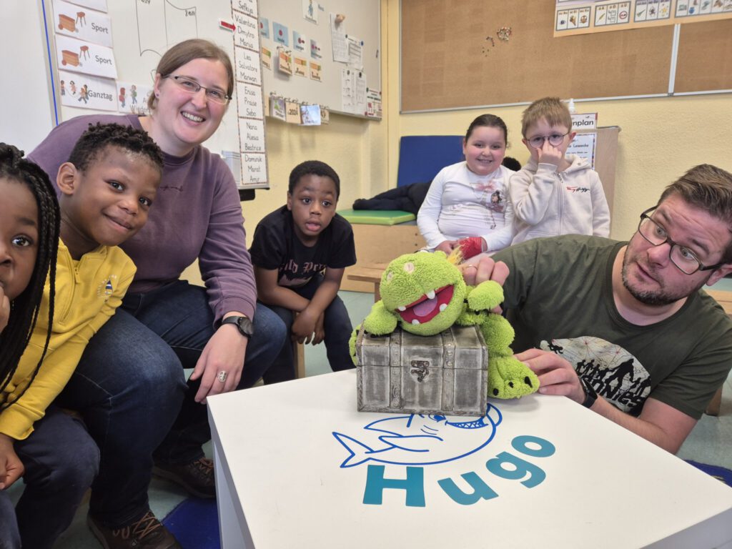 Jede Woche kommt in Klasse 1 der kleine Drache Lobo vom Planeten Globo. Gemeinsam wird gereimt oder Silben geklatscht. Zuletzt hat Lobo mit den Kindern einen Blick in eine Schatzkiste geworfen. Darin lauter Dinge zum Anlaut „A“. Zusammen mit Lobo lernen die Erstklässler nun zu den Buchstaben.