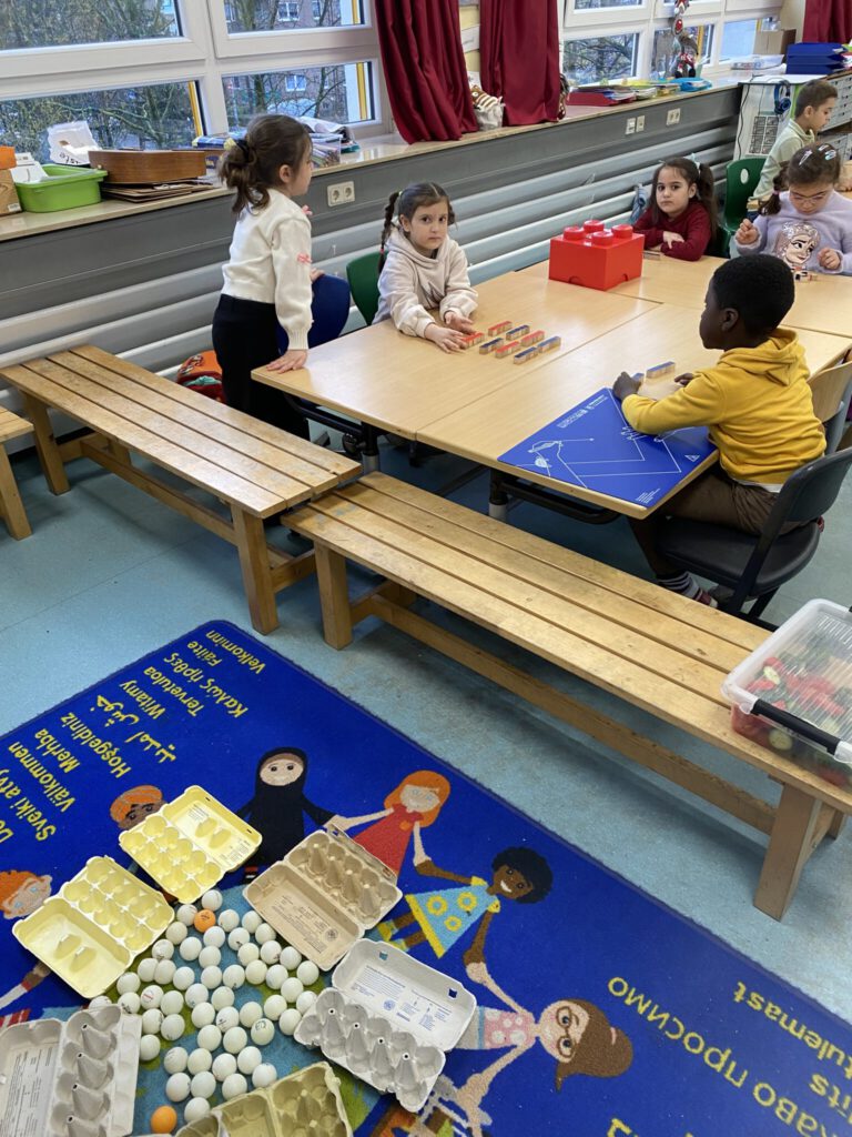 In der Klasse 1b steht das handelnde Lernen im Mathematikunterricht im Mittelpunkt. Die Kinder entdecken mathematische Inhalte mit allen Sinnen: Sie legen, bauen, sortieren, vergleichen und experimentieren mit vielfältigem Material. Durch dieses aktive Tun entwickeln sie ein tieferes Verständnis für Zahlen, Formen und erste Rechenoperationen.
