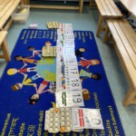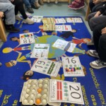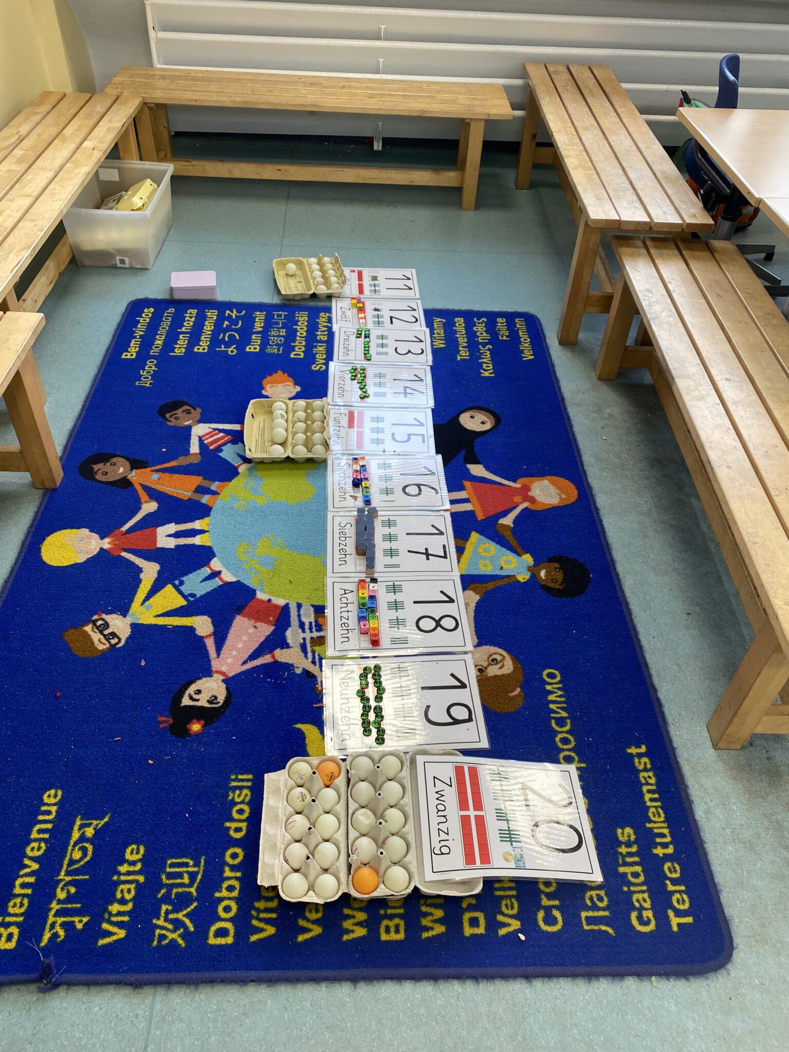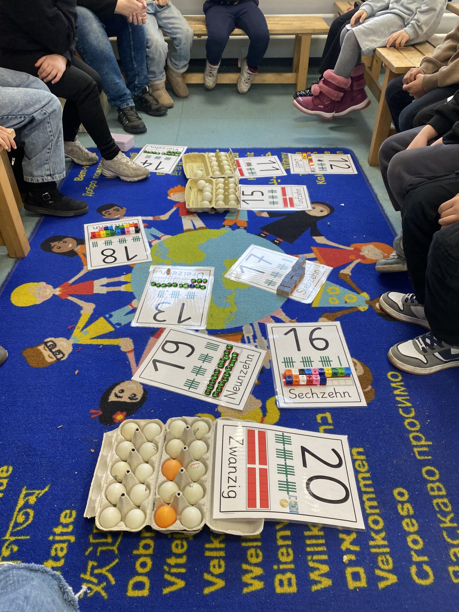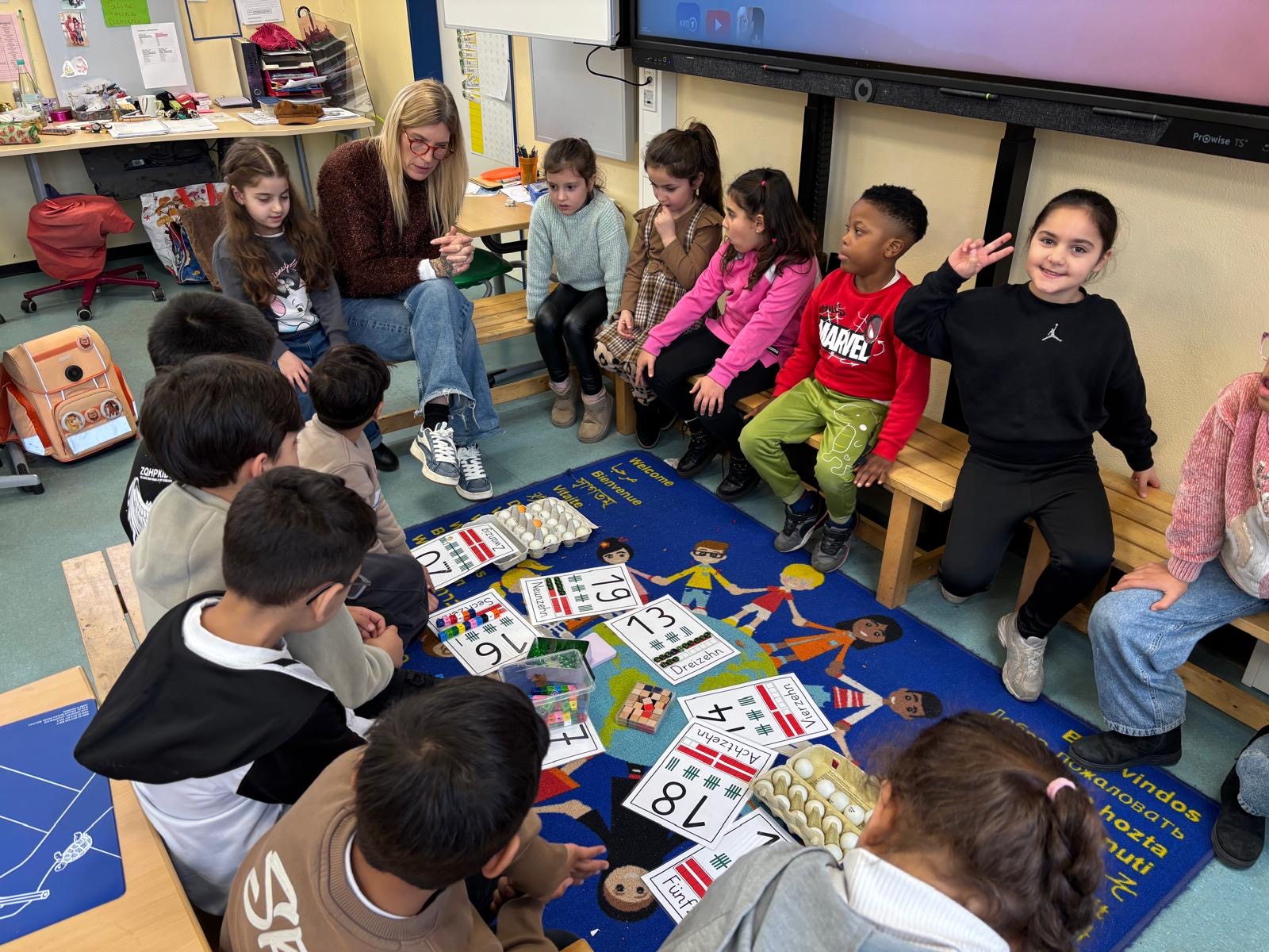 In unserer Klasse 1b wird Mathematik mit allen Sinnen erlebt. Bei der Erweiterung des Zahlenraums von 10 auf 20 arbeiten die Kinder aktiv mit verschiedenen Materialien wie Eierkartons, Steckwürfeln und Muggelsteinen. Durch das Anfassen, Legen, Ordnen und Vergleichen entwickeln die Kinder ein sicheres Mengen- und Zahlenverständnis. Mit Hilfe der 10er Eierkartons erkennen die Kinder schnell, wie Mengen aufgebaut sind und wie sich die neuen Zahlen aus Zehnern und Einern zusammensetzen. Steckwürfel unterstützen das Bündeln und Zerlegen, während Muggelsteine zum freien Legen und Ordnen anregen.